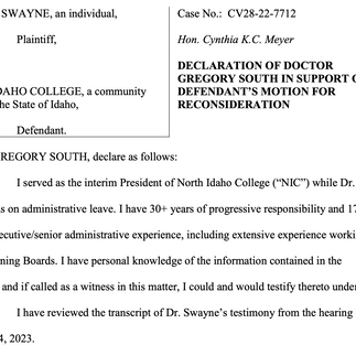 "On Friday March 17th, North Idaho College filed an appeal against President Nick Swayne, claiming that the court had no legal right to bypass NIC policy, arguing that Swaynes Case Is “Unlikely to Prevail on the Merits” arguing that the board had the right to do so."